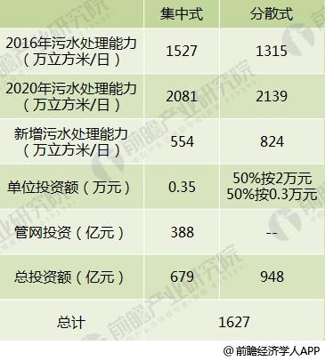 同樣,分散式模式污水處理能力按年均12.93%的復(fù)合增速計(jì)算,到2020年,污水處理能力達(dá)到2139萬立方米/日,較2016年新增824萬立方米/日,如果其中50%采用小型一體化污水處理裝置,噸投資額按20000元/立方米的投資計(jì)算,其余50%按3000元/立方米投資計(jì)算,分散式的污水總投資規(guī)模948億元,由此推算村鎮(zhèn)污水處理的市場規(guī)模在1627億元。