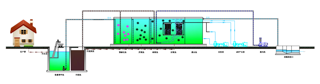 “鵬凱箱”(E-co Box)是一體化設備在MBBR的基礎上通過倒置AAO工藝,明晰預脫硝區(qū)、厭氧區(qū)、缺氧區(qū)和好氧區(qū)的功能的定位,優(yōu)化污泥回流系統(tǒng)和硝化液回流系統(tǒng)的布局結(jié)構(gòu),將活性污泥法和生物接觸氧化法的優(yōu)勢充分結(jié)合,在降低COD的同時強化脫氮除磷的效果。在缺氧條件下預脫硝區(qū)充分去除污水和污泥中的硝酸鹽和氧氣,保證厭氧區(qū)的嚴格厭氧環(huán)境,使得聚磷菌在厭氧區(qū)中釋放磷的效率大大提高,確保其在好氧池的吸磷效率相應得到了充分提升,通過將硝化液回流至缺氧池強化反應器脫氮能力,進一步實現(xiàn)鵬凱一體化設備對氮、磷的高效去除能力。