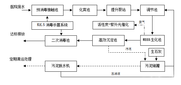 污水處理站工藝采用預(yù)消毒接觸池+化糞池+調(diào)節(jié)池+MBBR生化池+末端消毒處理工藝,經(jīng)消毒處理后的污水泵送至市政管網(wǎng)排入城市污水處理廠。系統(tǒng)工藝流程如下: