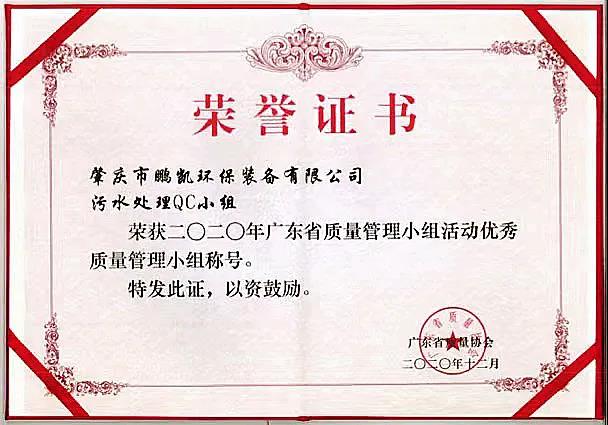 肇慶鵬凱污水處理QC小組獲評“優(yōu)秀質(zhì)量管理小組”稱號