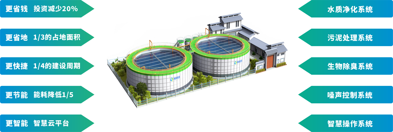 鵬凱圓-低碳高效裝配式污水廠以“工程設(shè)備化、設(shè)備標(biāo)準(zhǔn)化、運維智能化”為核心設(shè)計理念,開啟了工廠化預(yù)制污水處理系統(tǒng)的新模式,較傳統(tǒng)污水廠具有“2345”綜合優(yōu)勢:投資成本減少20%;占地面積僅為傳統(tǒng)污水廠的1/3;建設(shè)時間僅需傳統(tǒng)污水廠的1/4;能耗降低1/5。